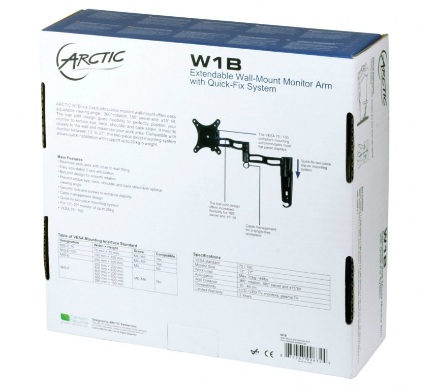 Arctic W1B pozwala zamontować pojedynczy monitor i zapewnia dla niego trzy płaszczyzny ruchu, oferuje płynną regulacją ekranu: obrotu wokół osi o 360°, 180° obrotu na boki i pochylenia o ± 15° nachylenia.