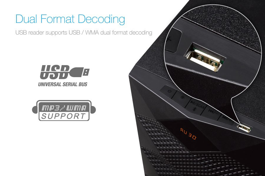 Ulubione utwory możesz odtwarzać również przez port USB. Do zestawu dołączony został także bezprzewodowy pilot, który umożliwi Ci sterowanie głośnikami Fenda A180X 2.1. na odległość.