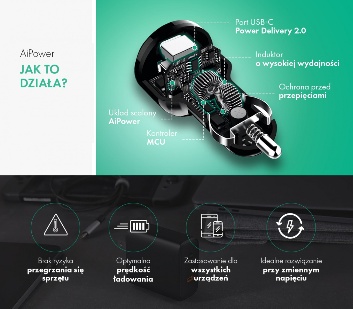 • Napięcie wyjściowe: USB-C Power Delivery 2.0: 5V 3A, 9V 2.5A, 12V 2A, USB-A AiPower: 5V 2.4A