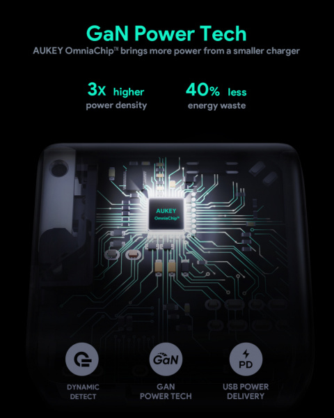 W ładowarce sieciowej Aukey Omnia GAN PA-B3 producent zastosował również technologię GaNFast. Użyto w niej zupełnie nowego materiału półprzewodnikowego (azotek galu), dzięki czemu może ona działać nawet sto razy (!) szybciej niż ładowarki z tradycyjnym krzemem w układzie mocy.