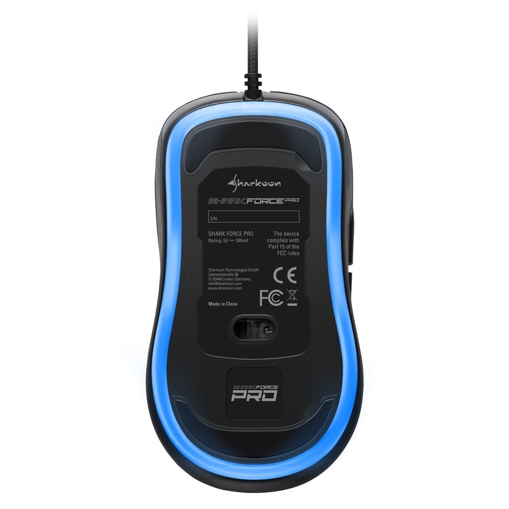 Minimalistyczna konstrukcja Sharkoon Shark Force PRO w kolorze czarnym posiada dodatkowe podświetlenie LED wzdłuż dolnych krawędzi. Zapewnia to dodatkowy aspekt wizualny, widoczny na podkładce lub biurku. Oprócz tego na tyle myszy umieszczono także podświetlane logo producenta.