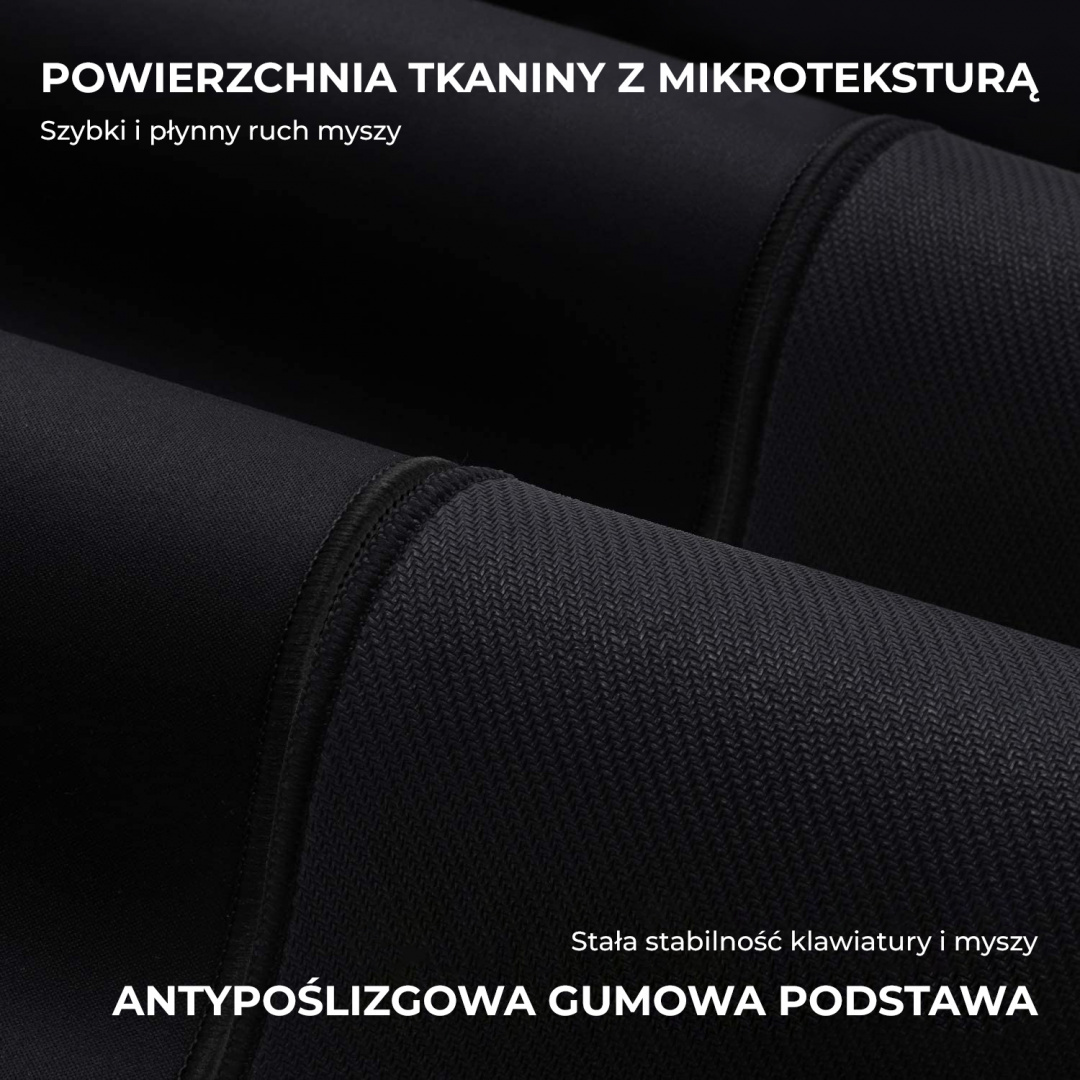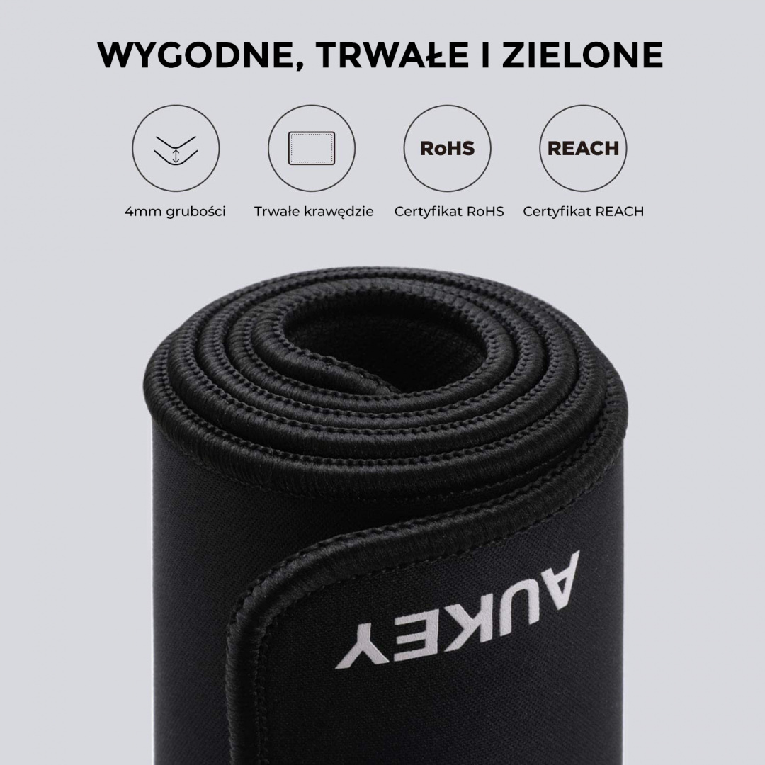 Prezentowana podkładka pod mysz jest przez producenta reklamowana jako model XXL Large Size. I rzeczywiście, wymiary ma słuszne - jej szerokość to aż 90 cm, a wysokość 40 cm, co w zupełności wystarcza na umieszczenie na niej nie tylko pełnowymiarowej klawiatury, ale i standardowej myszy. Podkładka wykonana została z miękkiej tkaniny, gumowa podstawa zapewnia dobre trzymanie się powierzchni biurka, a niewielka grubość modelu (4 mm) sprawia, że podkładkę możesz bez problemu zwinąć w rulon i wygodnie przetransportować. Mamy tu również precyzyjnie szyte krawędzie i łatwą w utrzymaniu w czystości wodoodporną powierzchnię. A to tylko wybrane zalety tej podkładki pod mysz marki Aukey. Czytaj dalej i dowiedz się, dlaczego jeszcze warto ją mieć.