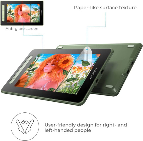 Tablet XP-Pen Artist 10 2nd Green został zaprojektowany w taki sposób, by użytkownik mógł bez problemu zabrać go ze sobą każde miejsce i korzystać z niego w dowolnym momencie. Wymiary modelu to 299 × 173,3 × 12,9 mm, z czego 224,49 × 126,7 mm to przestrzeń robocza. Ekran jest tu laminowany, matowy i antyodblaskowy, dzięki czemu swoje projekty będziesz mógł Tworzyć w każdych praktycznie warunkach. Laminacja ekranu sprawia, że błędy między końcówką rysika a kursorem zostały wyeliminowane, co zwiększa poziom precyzji. Matowość ekranu sprawia z kolei, że jest on bardziej przyjazny dla wzroku. Ten elegancki i dopracowany w najdrobniejszych szczegółach tablet graficzny sprawdzi się zarówno w domu, jak i w biurze. Zastosowano w nim technologię indukcji magnetycznej (EMR), wyposażono w znakomitą rozdzielczość (5080 LPI), a wysokość odczytu dla tego modelu wynosi 10 mm. Nie można nie wspomnieć też o imponującym kącie widzenia 178 stopni. To istotne, bo jak już wspomnieliśmy na początku ekran zielonego Artist 10 2nd jest wielofunkcyjny - może służyć do rysowania, szkicowania czy projektowania, ale również do innego rodzaju rozrywek, jak gry czy oglądanie filmów. Warto również dodać, że model występuje w czterech wersjach kolorystycznych - poza przedstawianym tu zielonym, w sprzedaży znalazły się również tablety czarne, niebieskie oraz różowe.