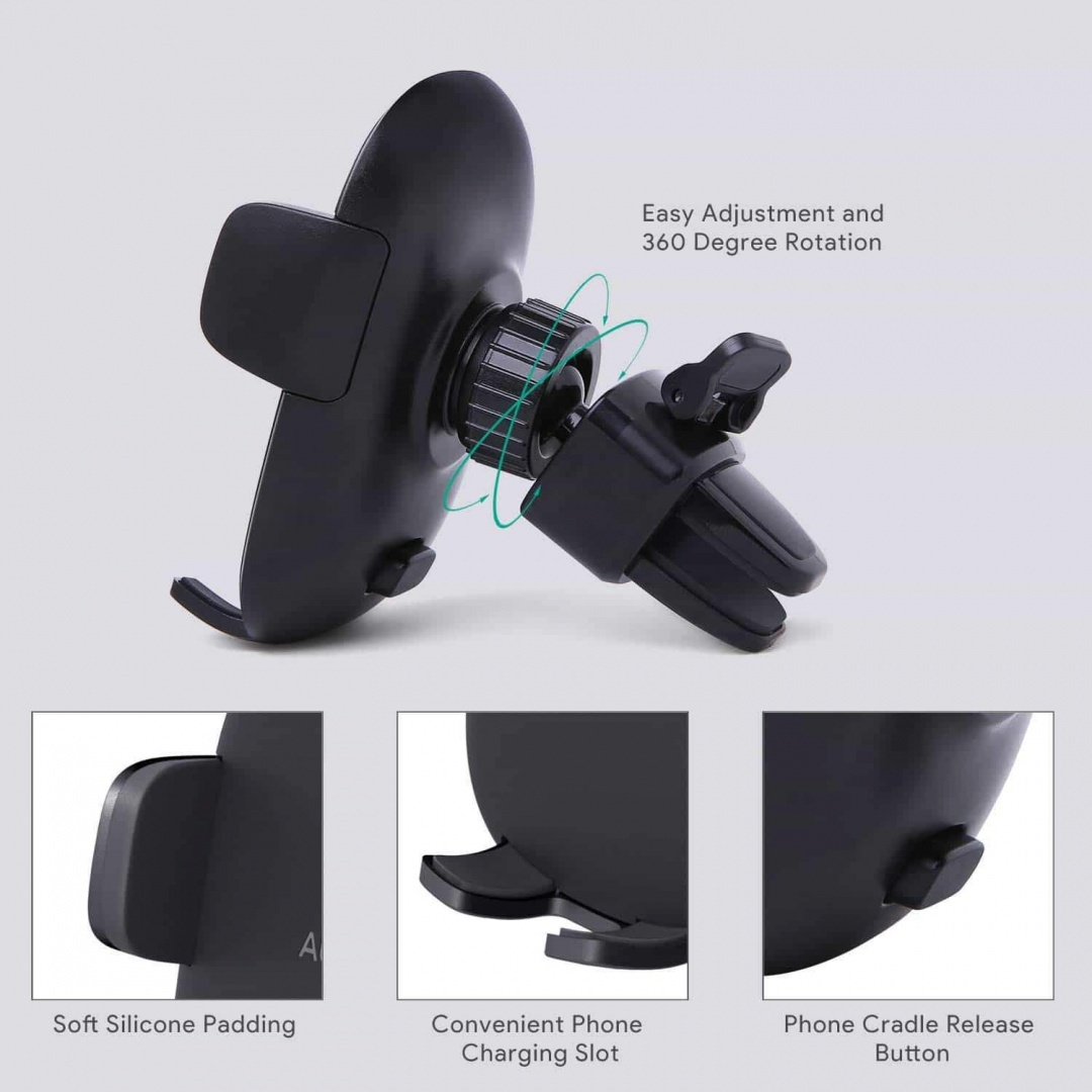 Uchwyt samochodowy Aukey HD-C48 wyposażony został w regulowaną podstawkę telefonu oraz w przycisk natychmiastowego zwolnienia. Producent zastosował w tym modelu coś jeszcze: obracany w zakresie 360° przegub kulowy. Takie rozwiązanie sprawia, że mamy do czynienia z możliwością ustawienia urządzenia pod idealnym kontem i szybkiego przełączania się pomiędzy widokiem poziomym oraz pionowym, w zależności od tego, który z nich będzie w danym momencie wygodniejszy dla użytkownika.