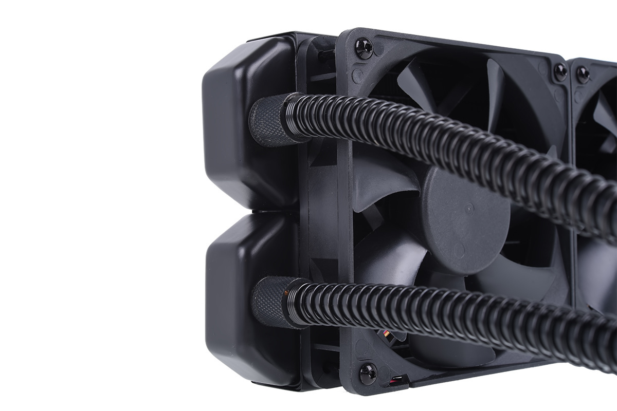 Chłodnica umieszczona w zestawie Alphacool Eiswolf 240 GPX Pro została w stu procentach wykonana z czystej miedzi. Oznacza to oczywiście, że cały układ chłodzący jest niezwykle wydajny – zdecydowanie przebija podobne produkty, w których zastosowany jest materiał z aluminium. Dwa bardzo efektywne wentylatory mające średnicę 120 milimetrów gwarantują prawidłowy obieg powietrza wokół finów chłodnicy. Nie musimy zatem obawiać się przegrzania. Niebiezpieczeństwo zażegnane!