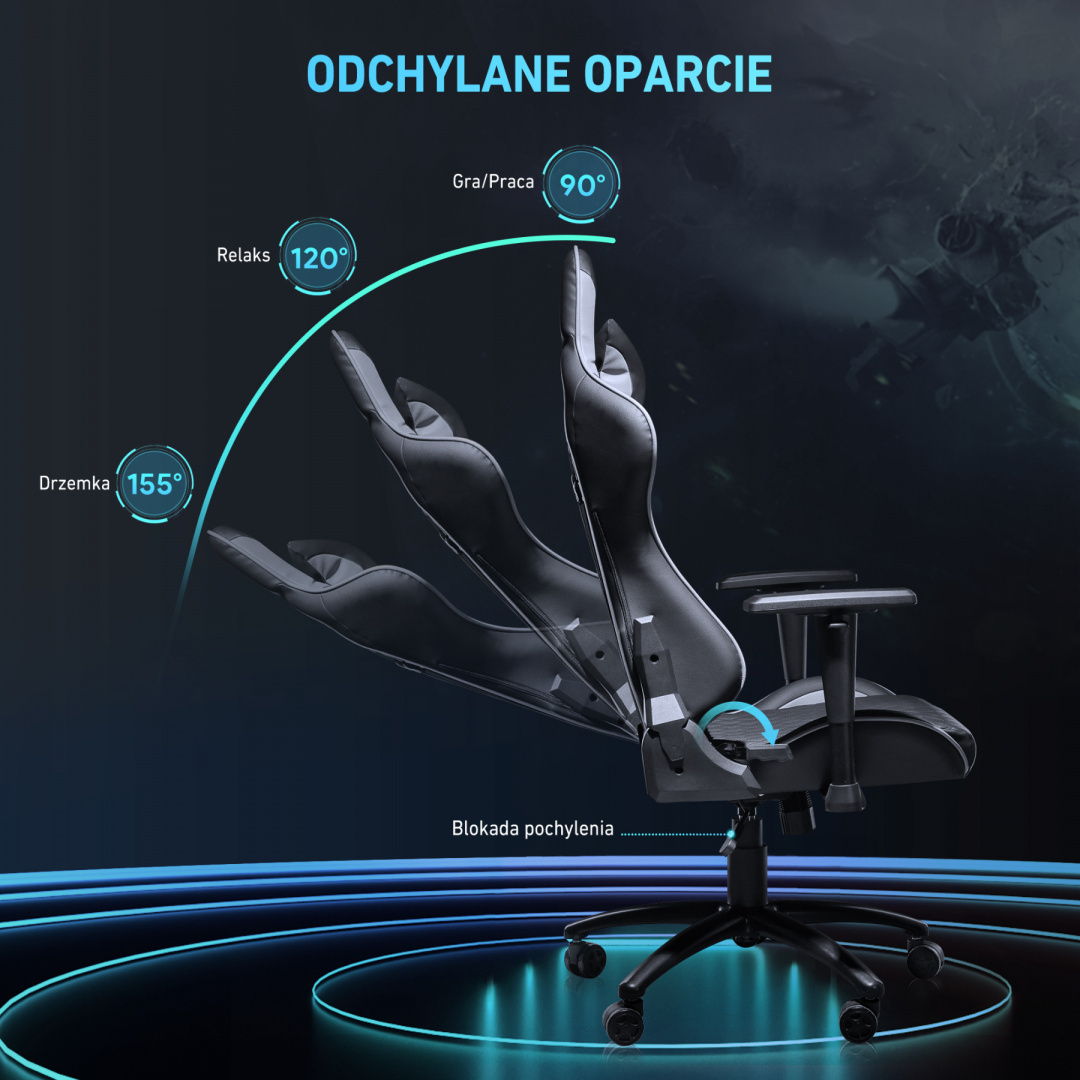 Szary fotel gamingowy Aukey GC-A01 wyposażony został w mechanizm TILT i umożliwia płynne ustawienie i pewne zablokowanie odchylenia oparcia w wybranej pozycji. Producent rekomenduje 90° odchylenia dla pracy, 120° dla relaksu i 155° dla drzemki, jednak nie musisz się tym sugerować – sam zdecyduj, jakie ustawienie oparcia będzie dla Ciebie najwygodniejsze. W modelu tym regulowana jest oczywiście wysokość siedziska (w zakresie 10 cm), ale możesz też modyfikować wysokość podłokietników (w zakresie 7 cm), a dodatkowo ustawić ich odchylenie w poziomie (w zakresie 15°). Jak zapewne się domyślasz, obrót samego fotela to 360° - wygrywając kolejne wirtualne potyczki, możesz więc w pełni wyrażać swoją radość, wirując niczym derwisz.