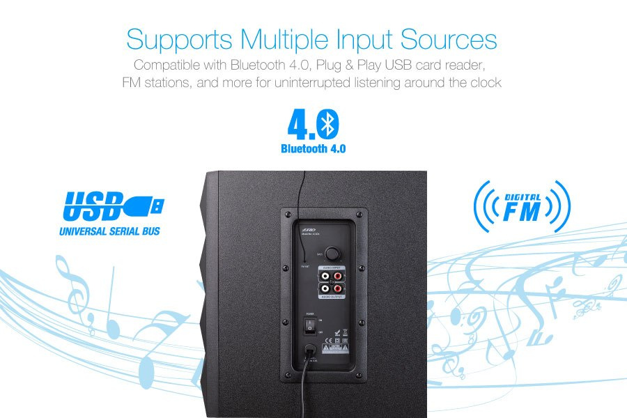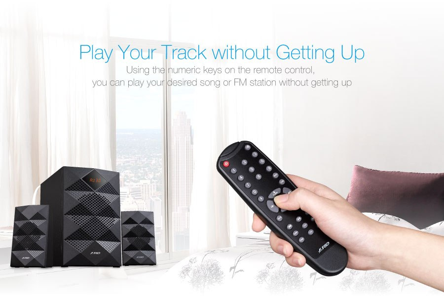 Ulubione utwory możesz odtwarzać również przez port USB. Do zestawu dołączony został także bezprzewodowy pilot, który umożliwi Ci sterowanie głośnikami Fenda A180X 2.1. na odległość.