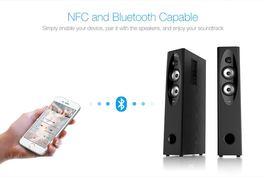 Na wspomnianym panelu bocznym znajduje się także port USB i za jego pomocą również odtworzyć możesz muzykę. Oczywiście do Fenda T-60X bez problemu podepniesz komputer, DVD czy telewizor - wykorzystasz do tego albo RCA, albo złącze optyczne. To nie koniec - prezentowany model posiada wbudowany moduł Bluetooth NFC - bezprzewodowe odtwarzanie dźwięku nie będzie więc w tym przypadku żadnym problemem.