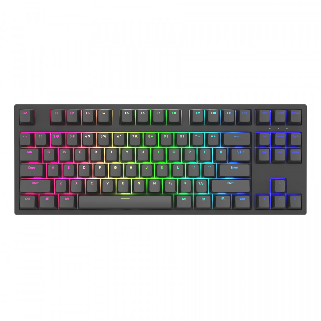 Klawiatura Dark Project KD87A Black PBT to klasyczny model kompaktowy TKL (80%), wyposażony w 87 klawiszy, utrzymany w kolorach klasycznej czerni i charakteryzujący się minimalistycznym, pozbawionym zbędnych udziwnień designem. Już na pierwszy rzut oka widać, jak olbrzymią wagę producent przywiązał tu do najdrobniejszych szczegółów. Zarówno elegancka stylistyka, jak i kolorystyka modelu sprawiają, że bez problemu dopasuje się on do każdego praktycznie wyposażenia w pokoju gracza czy w biurze. Użytkownik ma tu dodatkowo możliwość regulacji podświetlenia RGB klawiatury i dostosowania go do własnych wymagań, o czym więcej za moment.