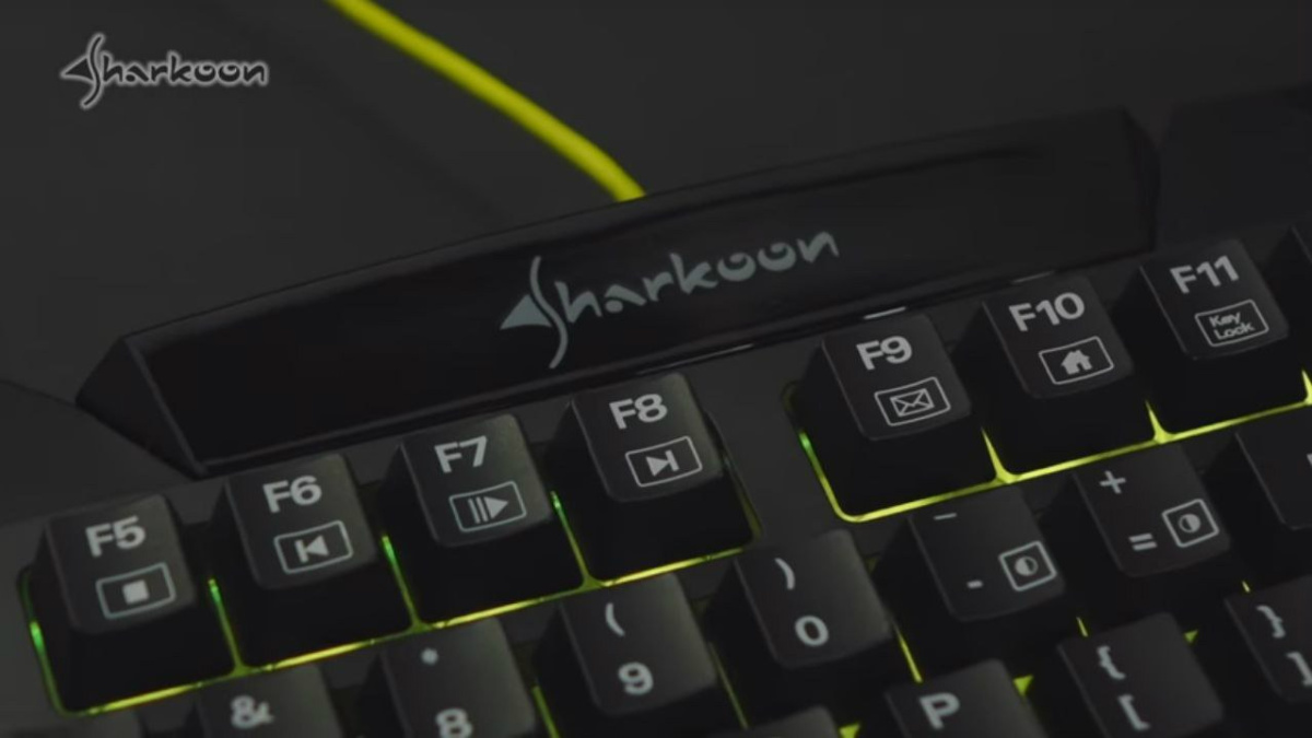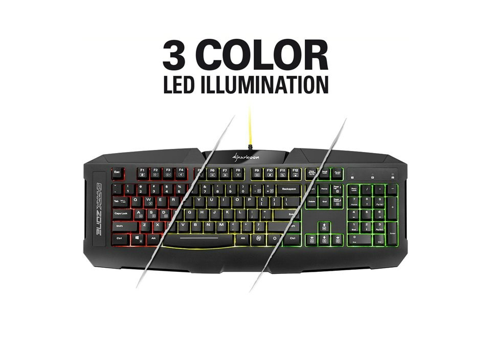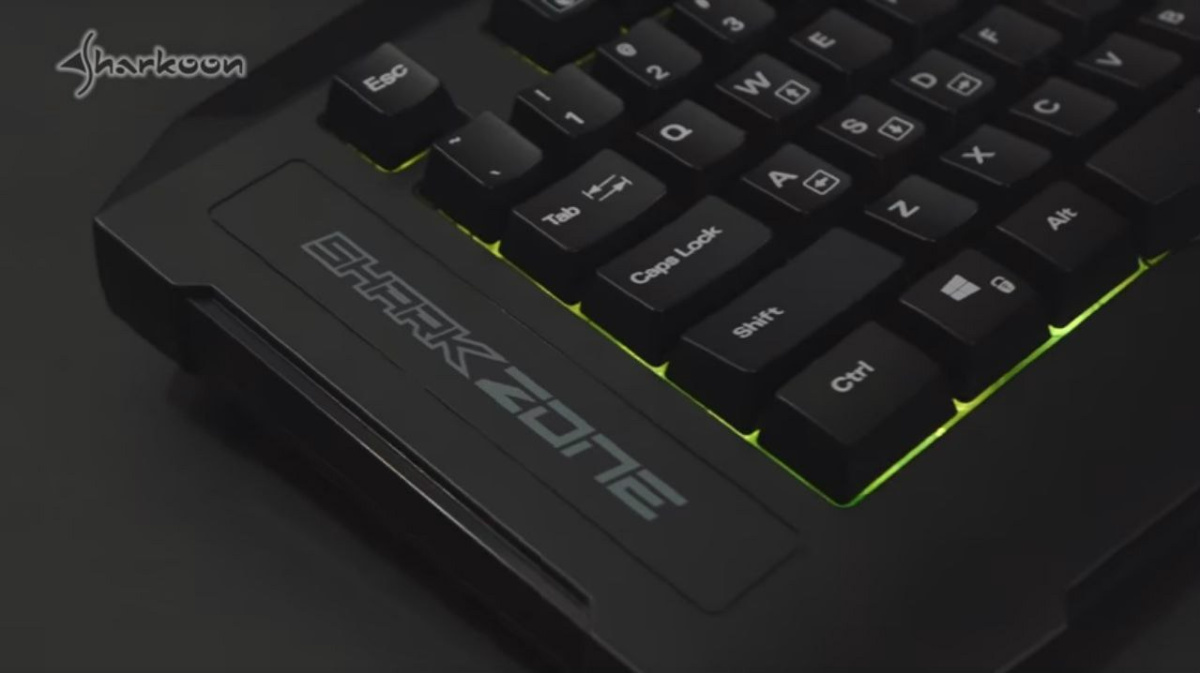 W zestawie Sharkoon Shark ZONE GK15 znajdziemy także gamingowa klawiaturę membranową. Posiada ona u góry klawisze multimedialne. Można taże ustawić tryb Gaming, czyli aby klawisz Windows nie powodował wyjścia z gry. Dodatkowo klawisze WASD i strzałki możemy zamienić pozycjami. Klawiatura dzięki zastosowaniu przełączników gumowych jest dość cicha, a do tego podświetlana na trzy różne kolory: żółty, czerwony, zielony. Dla kogoś, kto nie lubi podświetlenia można także je wyłączyć, lub ustawić aby kolory co jakiś czas się zmieniały.