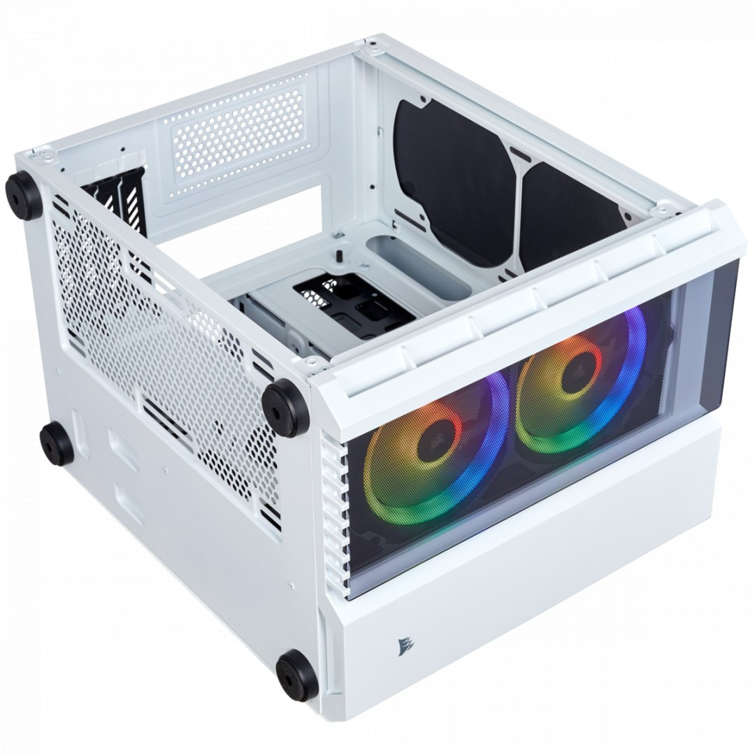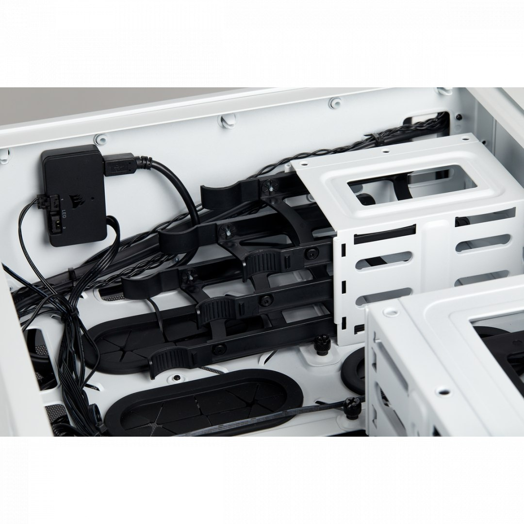 Bardzo dobrym rozwiązaniem w przypadku Corsair Crystal Series 280X RGB White jest osobna komora tylna. Znalazło się w niej miejsce na zasilacz i napędy. Jest to przestrzeń specjalnie wydzielona, w której zmieścisz trzy dyski 2,5’’ i dwa dyski 3,5’’. W zapanowaniu nad porządkiem we wnętrzu obudowy pomoże Ci także system aranżowania kabli oraz antykurzowe filtry. Z takimi rozwiązaniami nietrudno zadbać o porządek idealny.