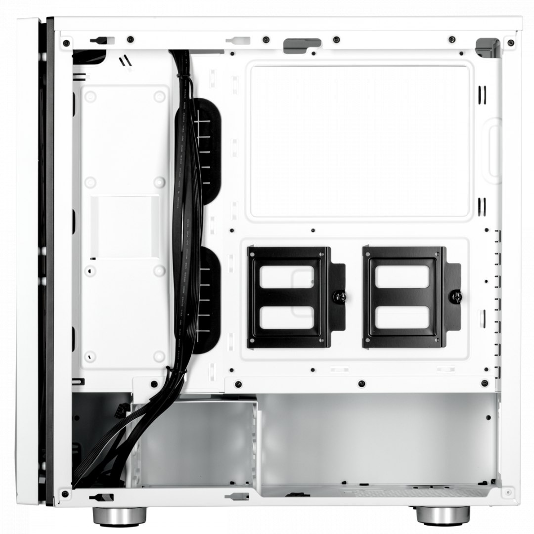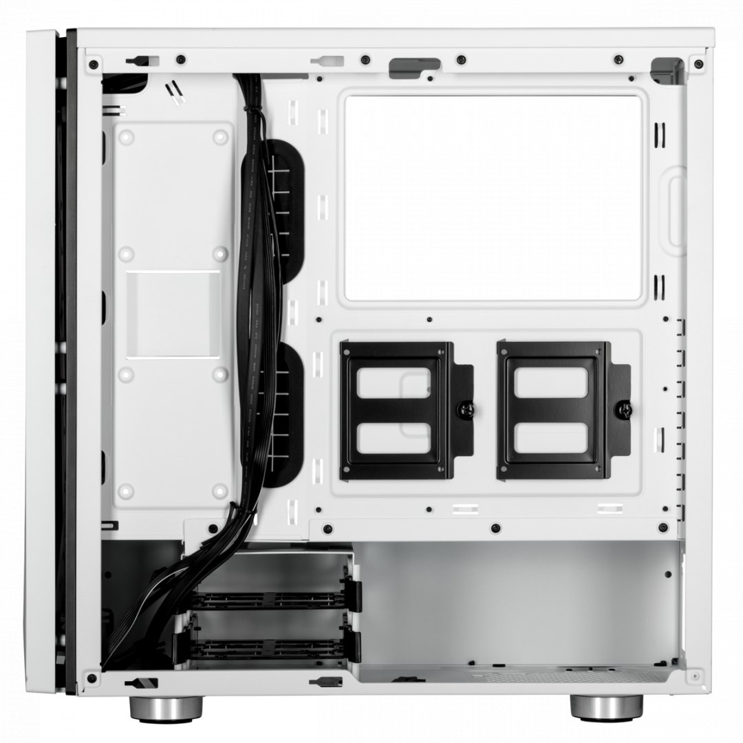 W przypadku nośników znalazło się miejsce dla dwóch dysków 3,5” w dolnej komorze, a także czterech dysków 2,5” za tacką płyty głównej. Kable mogą zostać uporządkowane dzięki specjalnemu systemowi zarządzania przewodami, co pozwoli zachować porządek i dobrą cyrkulację powietrza wewnątrz Corsair Carbide Series SPEC-06.