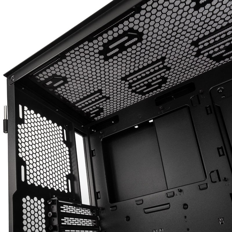 Lian Li Lancool II Mesh RGB pochwalić się może doskonałą wentylacją, jakiej ze świecą szukać w innych obudowach. To wszystko dzięki perforowanemu frontowi, całemu wypełnionemu otworami o średnicy 1,5 mm. Siatka mesh znalazła się również na bocznej klapie od komory zasilacza, a także na magnetycznym filtrze na górze konstrukcji. Całości dopełniają otwory wentylacyjne umieszczone na górze oraz z tyłu Lancool II.