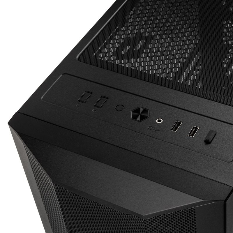 Panel I/O: 2x USB 3.0, 1x USB-C Gen 2 (opcjonalne), 1x audio, power, reset, przyciski do sterowania oświetleniem
