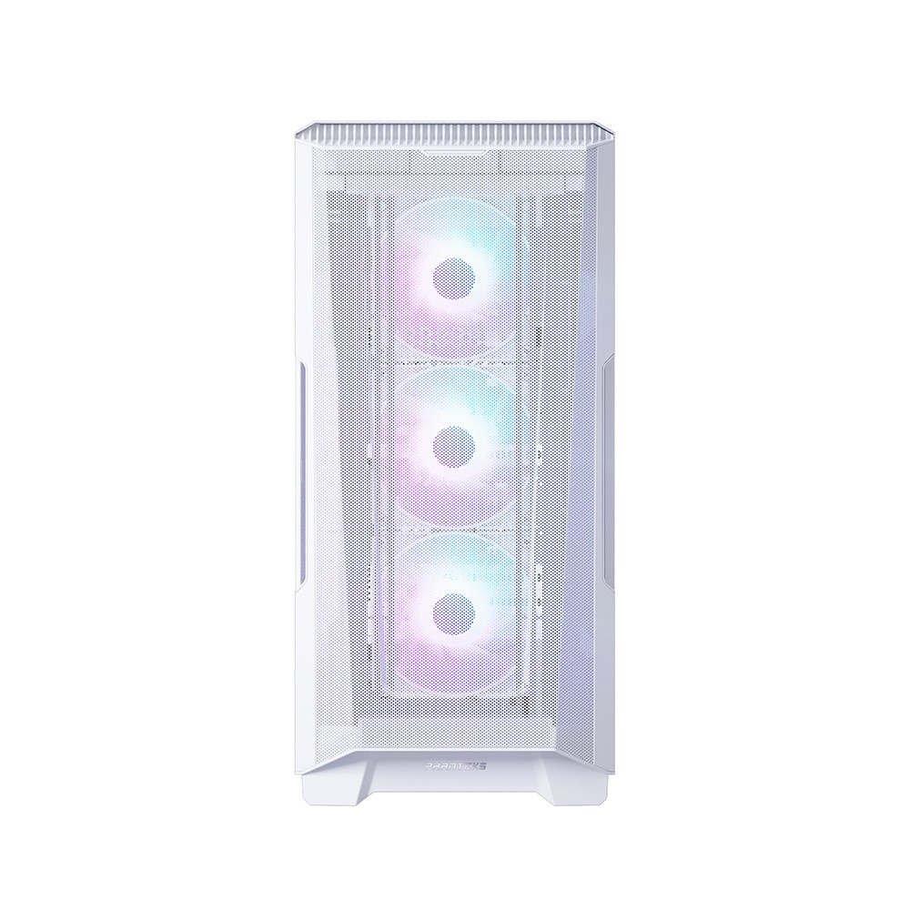 Obudowa PHANTEKS Eclipse P500A w matowym białym kolorze zaskakuje dopracowanym i nowoczesnym designem. Mamy tu 3-milimetrowy panel boczny z hartowanego szkła, który montowany jest na zawiasach, a jego całkowity demontaż nie nastręcza żadnych trudności. Rozwiązanie to umożliwia obserwowanie pracy znajdujących się wewnątrz modelu podzespołów. Dzięki podświetleniu D-RGB efekt jest jeszcze bardziej imponujący. Tym bardziej że samym podświetleniem użytkownik może tu samodzielnie sterować - albo za pomocą przycisków na górnym panelu obudowy, albo też podpinając je bezpośrednio pod płytę główną. Trzy fabrycznie zainstalowane podświetlane wentylatory znajdują się na samym froncie obudowy, który ma tutaj formę siateczkową.
