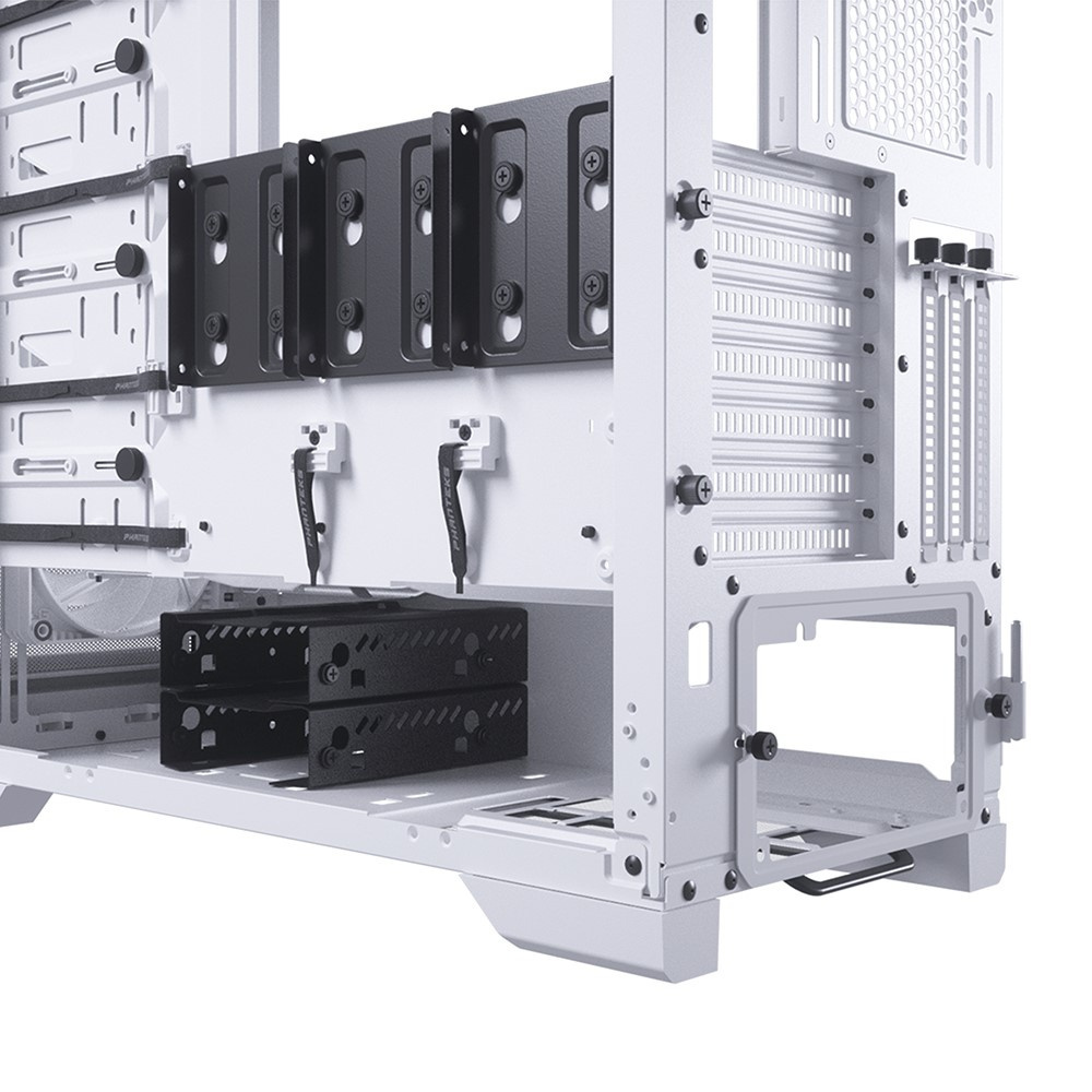 Biała obudowa PHANTEKS Eclipse P500A Matte white RGB umożliwia zainstalowanie wielu różnych napędów. Znalazły się w niej dwa miejsca dla dysków 2,5’’/3,5’ i trzy miejsca dla dysków 2,5’’. Ponieważ model jest naprawdę przestronny, użytkownik może też dość swobodnie konfigurować układ i rodzaje poszczególnych podzespołów. We wnętrzu umieścić można chociażby płyty główne w formatach od Mini-ITX do E-ATX, a także karty graficzne o długości do nawet 435 mm, z możliwością ich pionowej instalacji. Warto dodać, że w modelu tym zastosowano również system aranżacji kabli, dzięki któremu łatwiej Ci będzie ukryć zbędne przewody i utrzymać porządek wewnątrz obudowy.