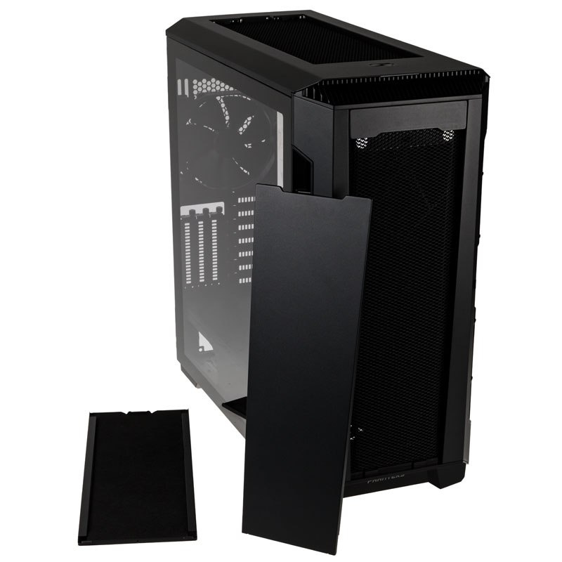 Zarówno panel boczny z przyciemnianego szkła hartowanego, jak i panel stalowy po prawej stronie obudowy Phanteks P600S, są do niej przymocowane za pomocą funkcjonalnych zawiasów. Dzięki takiemu rozwiązaniu możliwe staje się ich uchylanie. Co więcej, z łatwością zdjąć możesz również część frontu i część górną obudowy. Obie wyposażone są w materiał izolacyjny, za którym znajduje się drobna siatka z włókna syntetycznego. Z jednej strony zapewnia ona izolację dźwiękową, gdy osłony zostaną zdjęte, z drugiej - zapewnia odpowiedni przepływ powietrza. Nie możemy nie wspomnieć o filtrze przeciwkurzowym - ten również znalazł się w prezentowanej obudowie, zaraz za siatką, która przymocowywana jest magnetycznie z przodu.