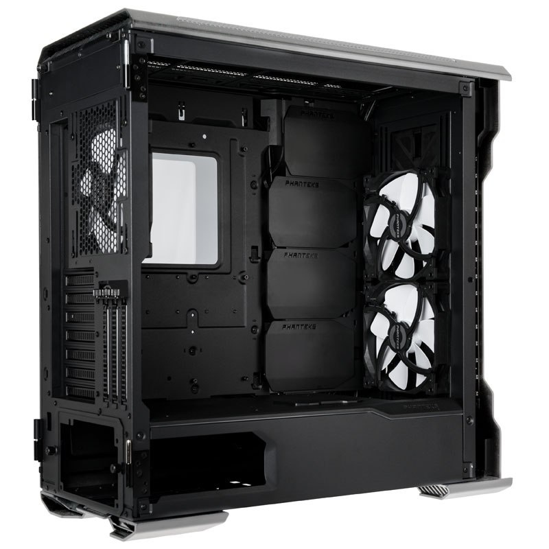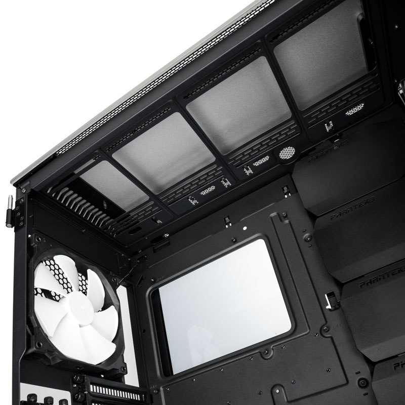 Myślisz że to wszystko? Nie tak szybko! Obudowa Phanteks Enthoo Evolv X ma hartowane, szklane boczne drzwi zamocowane na dwóch zawiasach. Od teraz możesz zachwycać się swoimi wewnętrznymi podzespołami podświetlonymi RGB! Producent dba o każdy szczegół, więc wpadł na pomysł, by pokryć krawędzie szklanych drzwi specjalną gumową powłoką. Sprawdza się doskonale i rzeczywiście skutecznie uszczelnia obudowę. Poprawia to ogólną cyrkulację powietrza. Phanteks chce, aby przepływ był jeszcze lepszy, a bezpieczeństwo podzespołów stało na jak najwyższym poziomie. W związku z tym powiększone zostały wloty powietrza z przodu oraz otwory wylotowe.