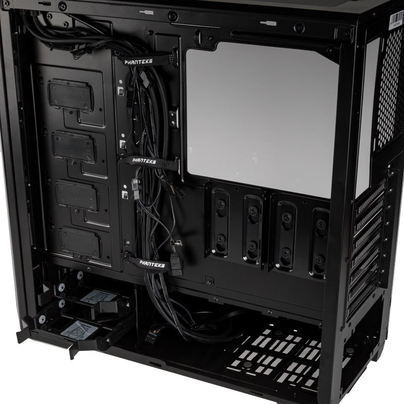 Aby zachować spójność, nie tylko część zewnętrzna, ale i wnętrze obudowy Eclipse P400A Midi Tower Tempered Glass DRGB Black pomalowane zostało na czarny kolor. Pokrywa zasilacza dzieli wnętrze na dwie części, z perforowaną kratką, która znalazła się u góry. Masz możliwość beznarzędziowego zamontowania we wnęce osłony zasilacza dwóch dysków 3,5 albo 2,5 cala (po stronie prawej, po uprzednim zdjęciu bocznych paneli). Ponadto za półką płyty głównej zainstalować możesz dyski SSD (maksymalnie dwie sztuki). Porządek w kablach bez problemu utrzymasz dzięki rozwiązaniu w postaci zapięć na rzepy.