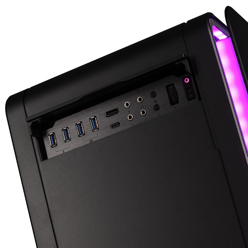 Na przednim panelu pod osłoną ukryto potężny panel I/O z czterema portami USB 3.0, portem USB-C 3.1, złączem HDMI 2.0, łącznie czterema gniazdami audio (2x słuchawkowe, 2x mikrofonowe, dla każdego z zestawów wewnątrz obudowy), przyciskami reset oraz pokrętłem do sterowania zintegrowanym oświetleniem RGB.