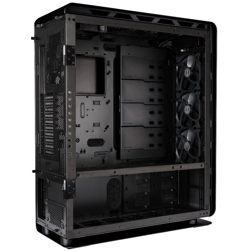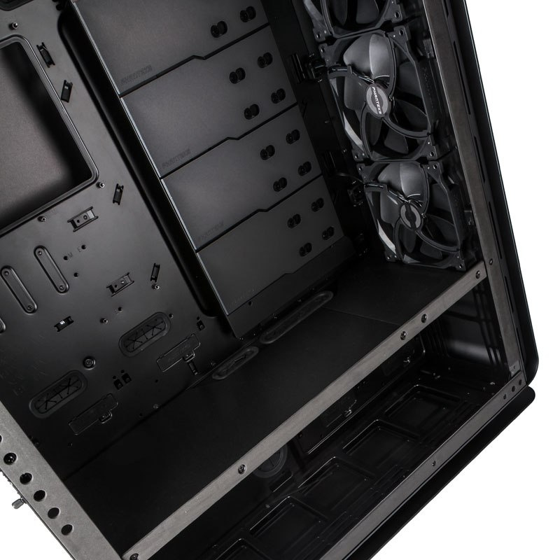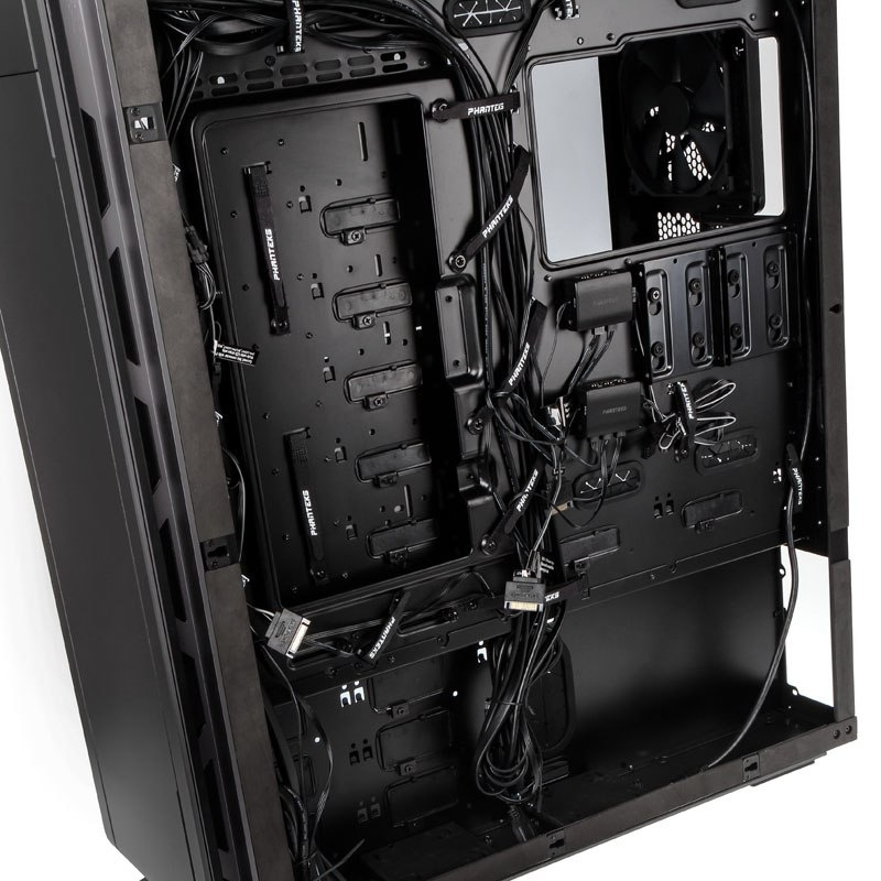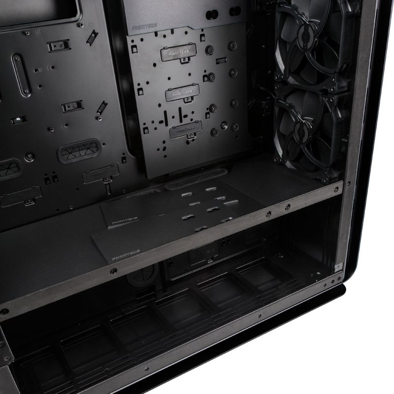 Olbrzymie wnętrz Phanteksa Enthoo Elite pomieści płyty formatu E-ATX, pełnowymiarowe karty graficzne oraz chłodzenie procesora o wysokości nawet 210 mm. Bez problemu można zająć się okablowaniem - na przewody przewidziano komorę za tacką płyty głównej o szerokości aż 35 mm. Ponadto w Enthoo Elite zmieści się 13 dysków 3,5”, 6 dysków 2,5”, a także maksymalnie 13 wentylatorów.