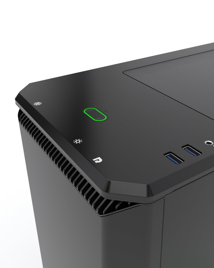 Obudowa posiada przycisk power, regulator obrotów, wentylatora, standardowe złącza audio oraz dwa porty USB 3.0.