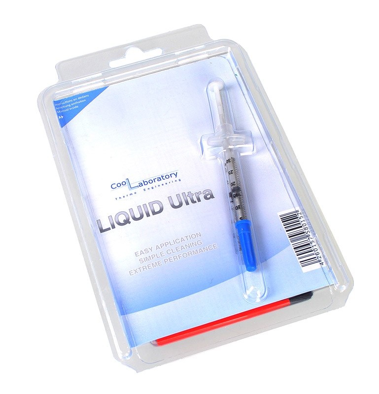 Liquid Ultra to płynny stop metali Gali, Indu oraz Cyny o bardzo wyjątkowych właściwościach termoprzewodzących. Jest on w 100% nieszkodliwy dla naszego zdrowia. Bardzo ważne jest, iż nie zawiera on niemetalicznych dodatków takich jak na przykład silikon. Brak w nim również jakichkolwiek składników stałych. Stanowi on zatem środek jednorodny. W temperaturze pokojowej pasta jest w płynnym stanie skupienia. Posiada również dużą gęstość, przez to w prosty i łatwy sposób się ją rozprowadza z pozytywnym rezultatem na powierzchni! Zastanawiasz się nad zakupem? Nie czekaj! Potwierdzona jest aż dziesięciokrotnie większa skuteczność w porównaniu do dobrej jakości past termoprzewodzących oraz aż stukrotnie większa niż zwykłe pasty!