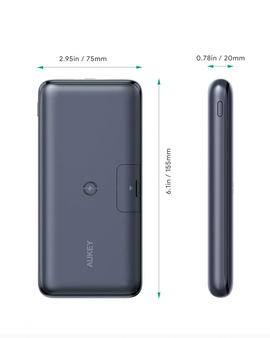 Minimalistyczny design to niejako znak rozpoznawczy Aukey, a powerbank PB-WL03S nie jest tutaj oczywiście żadnym wyjątkiem. Mamy zatem prostą, ale dopracowaną w każdym szczególe formę oraz klasyczną czerń jako kolor dominujący. Powerbank z pewnością świetnie zgra się dzięki temu z każdym wyposażeniem. Niewielkie wymiary (159 x 75 x 20 mm) i waga (355 g) sprawiają, że bez problemu zabierzesz go ze sobą wszędzie tam, gdzie może okazać się potrzebny — do biura, do sklepu, na rowerową wycieczkę czy w długą podróż. Z łatwością zmieści się nie tylko w torbie czy plecaku, ale również w kieszeni. Potężna moc, jaką oferuje to urządzenie, zapewni Ci prawdziwy spokój ducha — w razie potrzeby zawsze możesz bowiem sięgnąć po swój powerbank i uzupełnić energię w swoich urządzeniach mobilnych. Kolejnym atutem prezentowanego modelu są wysokiej jakości materiały, z których został on wykonany — solidne, wytrzymałe i bardzo odporne na przypadkowe uszkodzenia. Model na lata? Jak najbardziej!