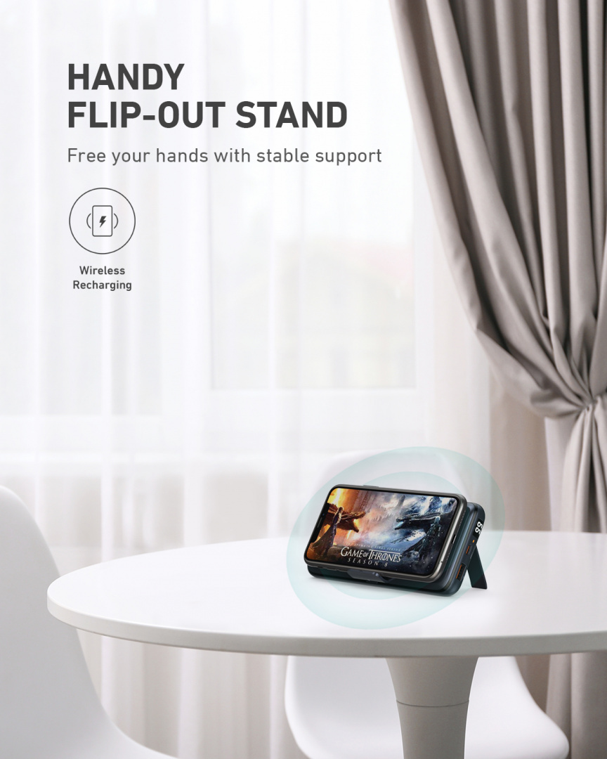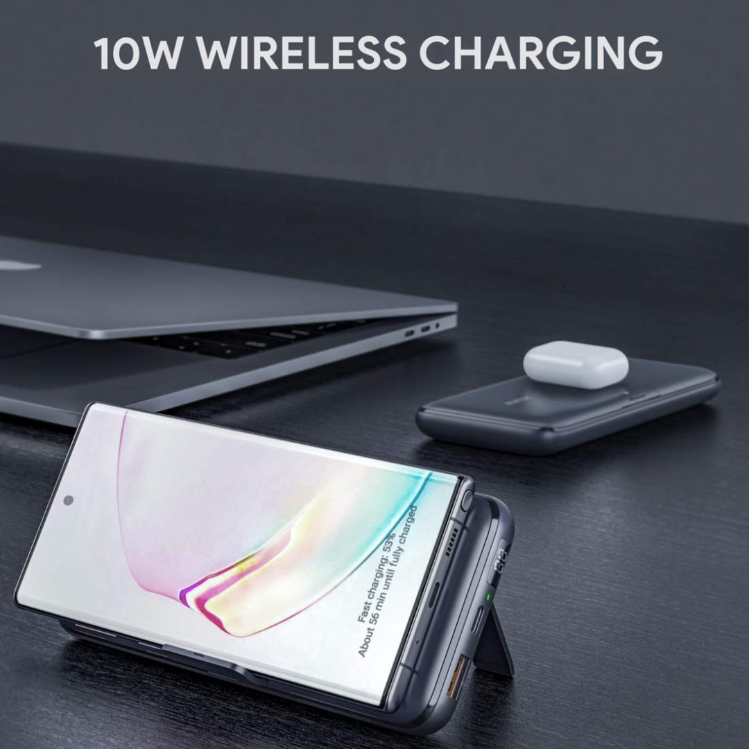 Dzięki bezprzewodowej podstawce ładującej, w którą wyposażony został powerbank Aukey PB-WL03S, możesz wygodnie ładować swoje urządzenia zgodne z Qi z mocą do 10 W bez podłączania kabla. Model obsługuje poziomy wyjściowe sieci bezprzewodowej 5 W, 7,5 W i 10 W. Dwunożny stojak zapewni ładowanym urządzeniom dodatkową stabilność. Podczas ładowania możesz ustawić ekran swojego telefonu w najwygodniejszej dla Ciebie pozycji i np. oglądać film, wysyłać SMS-y, prowadzić wideo rozmowę czy korzystać z portali społecznościowych. No i w końcu zapomnieć o irytujących, wiecznie plączących się wokół kablach…