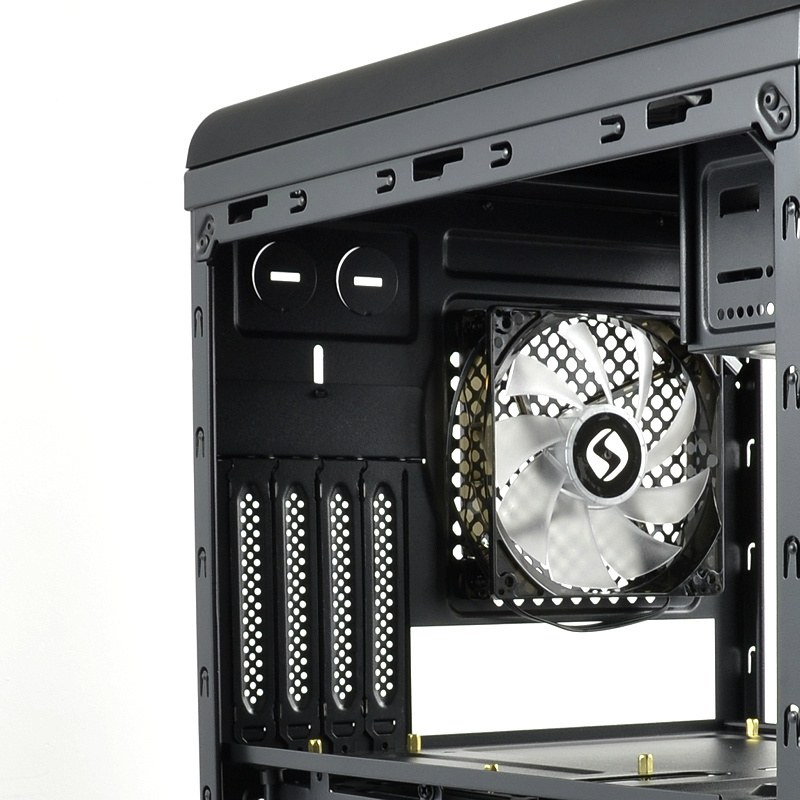 Wentylacja w obudowie stoi na wysokim poziomie: na przodzie zastosowano 200 mm wentylator oraz podświetlany na biało 120 mm wentylator wyciągowy z tyłu. Dodatkowo użytkownik może zamontować dwa wentylatory 120/140 mm na górze oraz jeden 80 mm na tylnej ściance w części z dyskami twardymi.