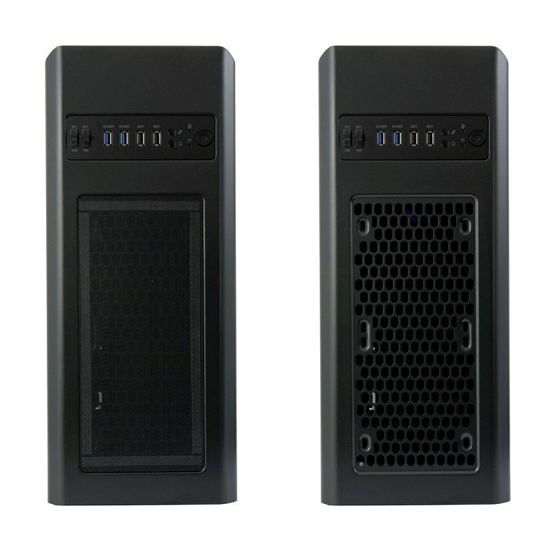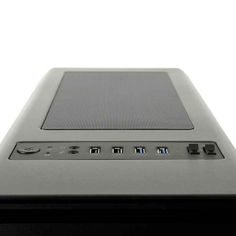 Na górze obudowy znajduje się duży przycisk zasilania, mały przycisk reset, dwa złącza USB 3.0, dwa kolejne w standardzie USB 2.0, gniazdo mikrofonu i słuchawek oraz dwa suwaki kontrolera obrotów wentylatorów.