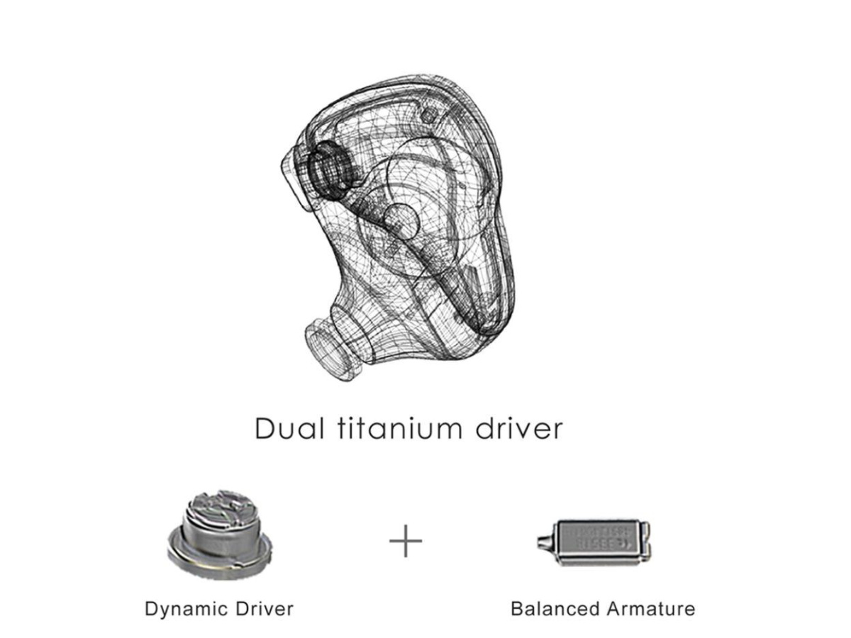 - Przetwornik: hybrydowy, dynamiczny 10 mm z membraną z kompozytu polimerowego pokrytego tytanem, zbalansowana armatura Knowles 33518