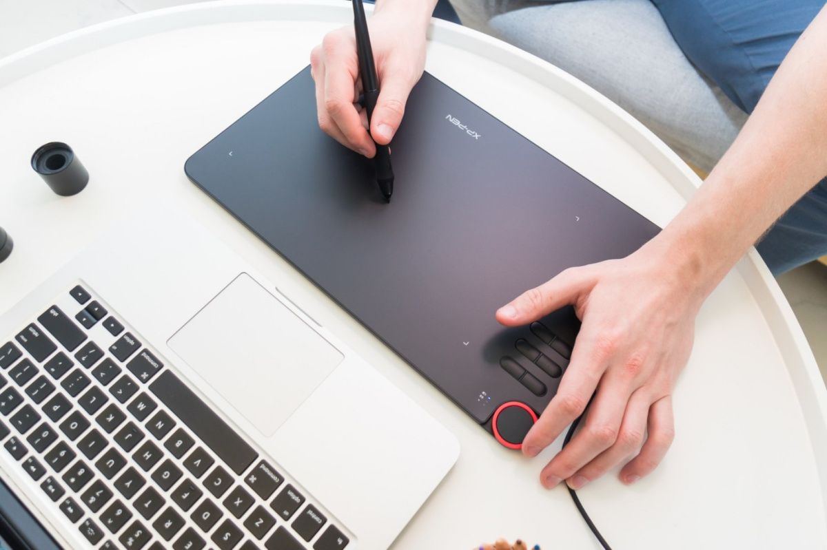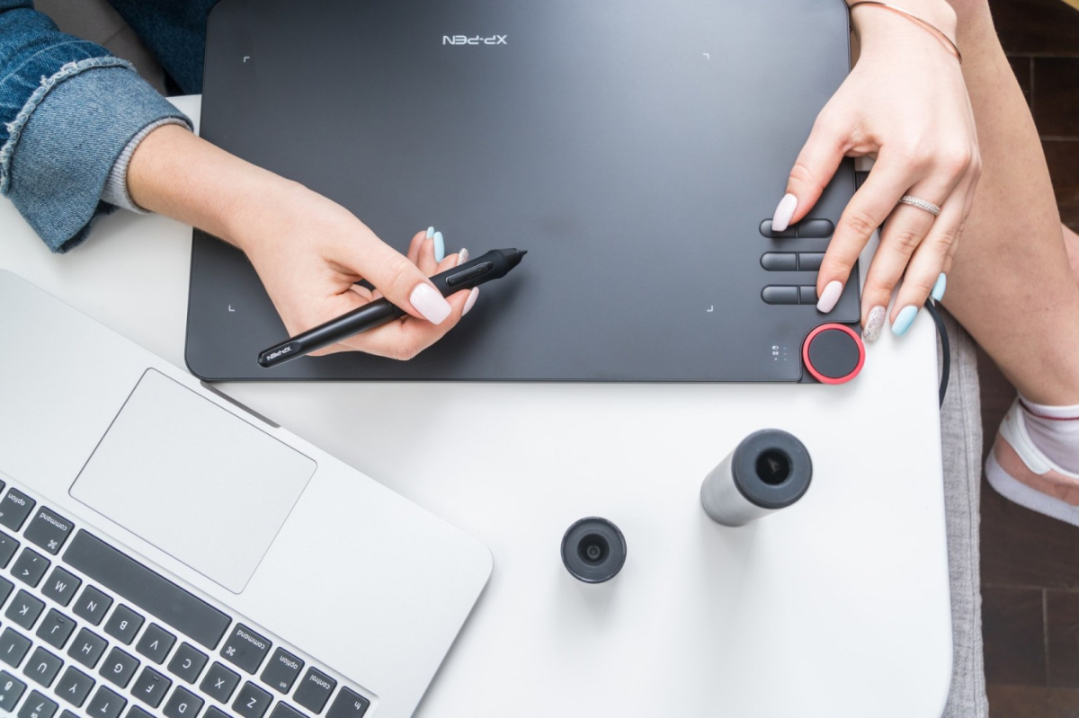XP-Pen DECO 03 to tablet graficzny, którego używać mogą zarówno osoby prawo-, jak i leworęczne (wystarczy przełączyć tryb pracy w urządzeniu).