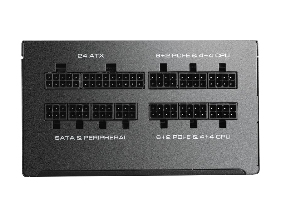 - Złącza: 1x CPU 4+4 pin, 4x PCI-E 6+2 pin, 3x MOLEX 4 pin, 8x SATA, 1x EPS 20+4 pin